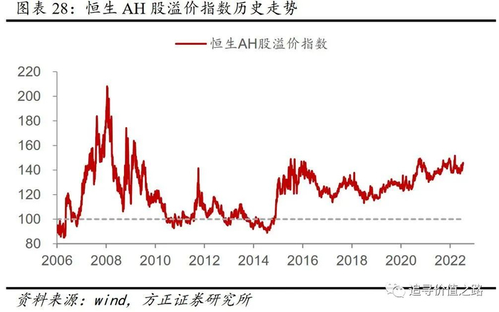在发达经济体的资本市场,同一公司在海外市场的交易价格通常高于在本地市场的股价,即海外股溢价现象。而在我国股票市场,同一公司无论是H股还是B股,其股价大都低于A股本地市场的价格,即存在本地股溢价现象,引起AH股溢价波动的原因,存在信息不对称、流动性差异、需求弹性差异、风险偏好、分红制度差异等多种解释。恒生沪深港通AH股溢价指数系统反映了在内地和香港两地同时上市的股票的价格差异。指数走高,代表A股相对H股越贵。基于一些因素,A股相对于H股长期存在溢价现象(指数大于100)。截至2022年7月16日,恒生AH股溢价指数达145.28,相较于上月指数上涨2.03,目前的AH股溢价仍然处于高位。