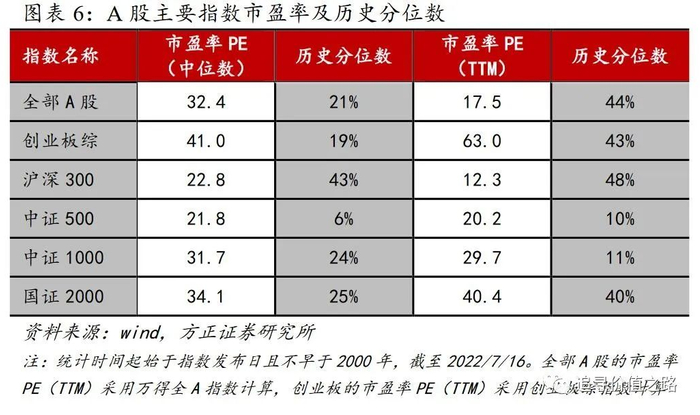 截至2022年7月16日,全部A股市盈率中位数为32.4倍,位于2000年至今21%的历史分位数水平,当前A股整体估值中位数处于较低水平。