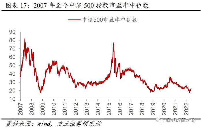 截至2022年7月16日,中证500市盈率中位数为21.8倍,位于2007年至今6%的历史分位数水平;中证500市盈率75分位数除以25分位数的比值为3.24倍,内部估值分化程度位于2007年至今83%的历史分位数水平。