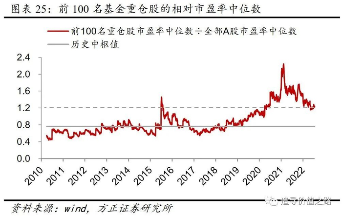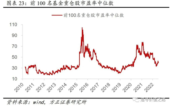 截至2022年7月16日,前100名重仓股市盈率中位数除以全部A股市盈率中位数的当前比值为1.24,位于2010年至今83%的历史分位数水平,这一比值已接近2020年一季度水平。重仓股的估值溢价受到行业竞争格局、企业盈利能力、抵御风险能力、未来市场空间等多重因素影响,估值溢价从长期来看可能伴随着新的风险事件出现而上升。