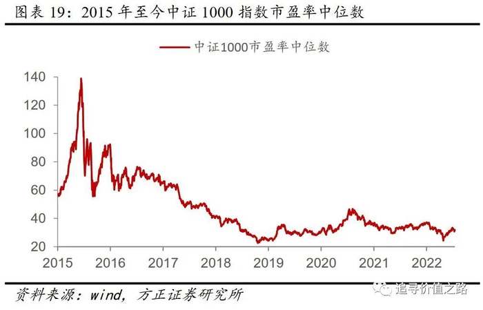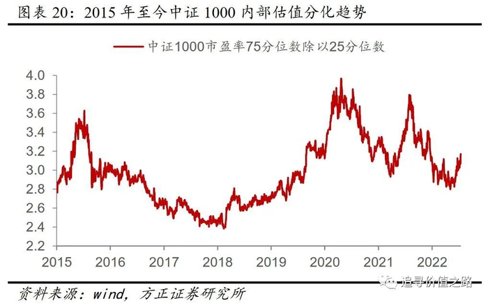 截至2022年7月16日,中证1000市盈率中位数为31.7倍,位于2015年至今24%的历史分位数水平;中证1000市盈率75分位数除以25分位数的比值为3.17倍,内部估值分化程度位于2015年至今71%的历史分位数水平。
