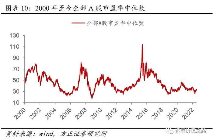 相较于全球市场而言,A股市场易于获得更丰富的估值数据。考虑到在今年的经济环境中,行情风格变化多样,除了总体指标,市场同时也关注结构性指标。在接下来的A股市场估值讨论中,我们引入指数内部所有成分股的估值的中位数(剔除负值)作为前面章节所使用的整体法计算得到的市盈率(TTM)和市净率(LF)的补充。