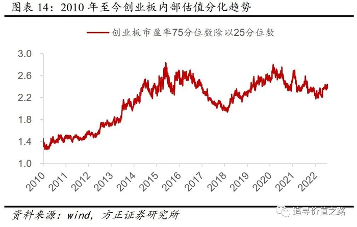 截至2022年7月16日,创业板市盈率75分位数除以25分位数的比值为2.44倍,内部估值分化程度位于2010年至今74%的历史分位数水平。可以看到自2021年春节后开始,创业板的估值分化水平出现显著下降,当前这一比值大约处在近三年低点。这意味着板块内部的行情正在从大幅溢价的大盘股向长期低迷的小盘股持续扩散。