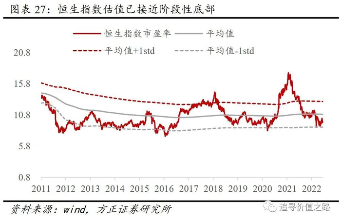 以恒生指数市盈率为例,观察目前港股的估值水平。截至2022年7月16日,恒生指数估值与自身过去十年的历史数据对比,目前的估值已接近平均值减一倍标准差的底部附近。