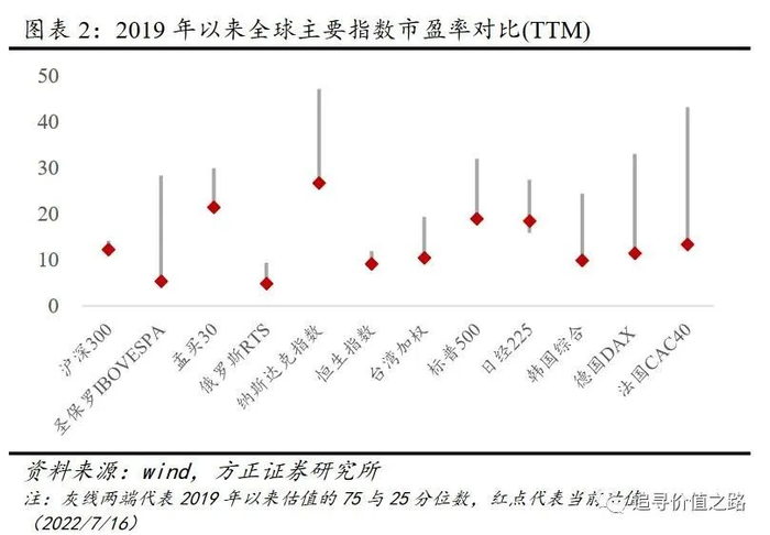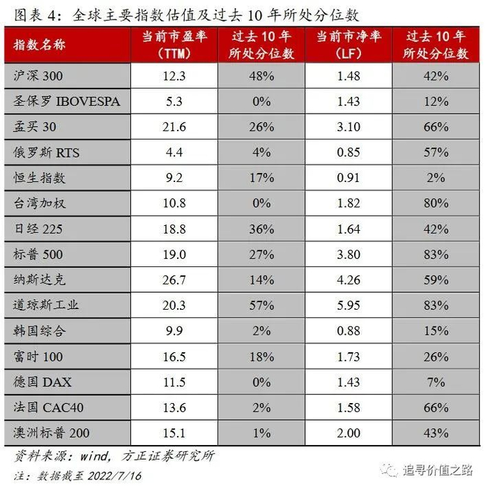 具体来看,截至2022年7月16日,沪深300指数市盈率(TTM,下同)为12.3倍,恒生指数为9.2倍,台湾加权指数为10.4倍。新兴市场中,巴西IBOVESPA指数市盈率低至5.4倍,俄罗斯RTS指数市盈率最低,仅为4.9倍,印度孟买30指数为21.4倍。发达经济体中,美国标普500指数市盈率达19.0倍,纳斯达克指数市盈率为26.7倍,日本日经225指数市盈率为18.5倍,韩国综合指数为9.9倍,德国DAX与法国CAC40指数市盈率分别为11.4倍和13.4倍。