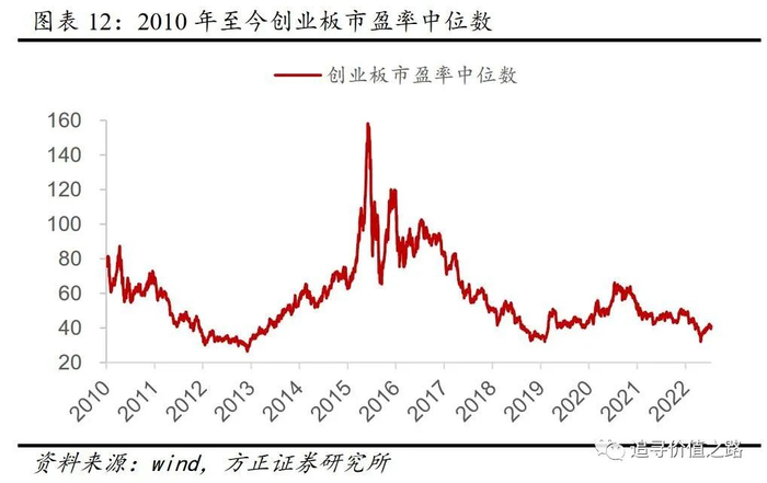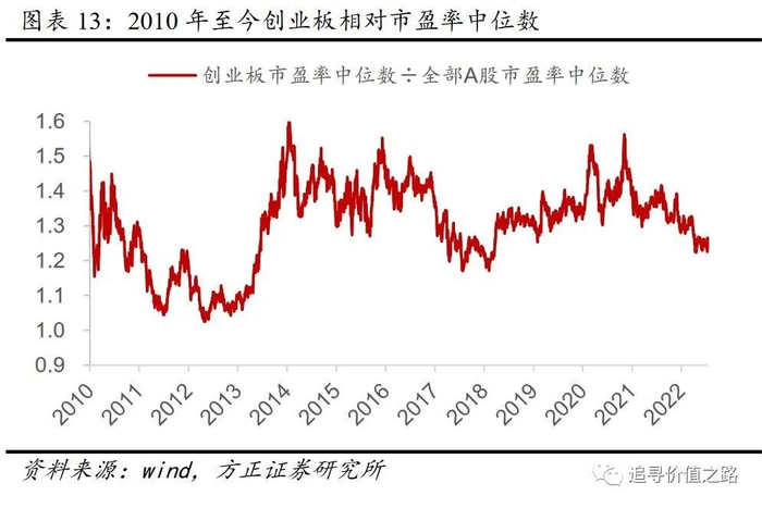 截至2022年7月16日,创业板市盈率中位数为41.0倍,位于2010年至今19%的历史分位数水平。创业板市盈率中位数除以全部A股市盈率中位数的比值为1.27,处于2010年至今31%的历史分位数水平。创业板相对市盈率中位数有所降低。