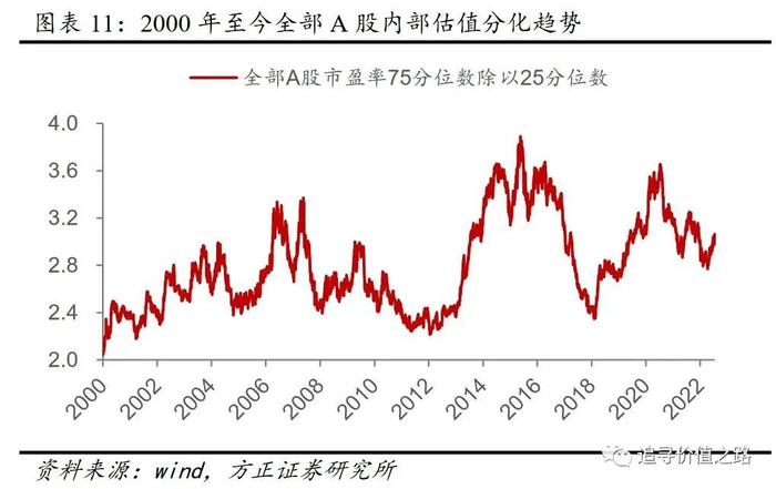 截至2022年7月16日,全部A股市盈率75分位数除以25分位数的比值为3.06倍,内部估值分化程度位于2000年至今73%的历史分位数水平。