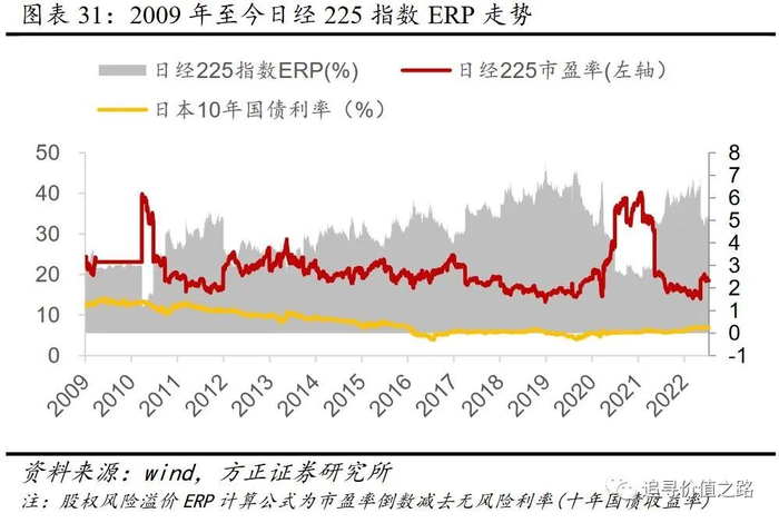截至2022年7月15日,日经225指数的市盈率为18.5倍,日本10年国债利率为0.24%,股权风险溢价ERP(市盈率倒数减去无风险利率)为5.17%,当前日经225指数ERP位于2009年以来的71%分位数水平,日本股市相较债市具有一定的估值性价比。