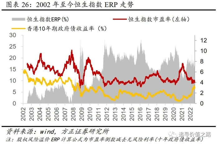 香港股市方面,截至2022年7月16日,恒生指数的市盈率为9.2倍,香港10年政府债收益率为2.96%,股权风险溢价ERP(市盈率倒数减去无风险利率)为7.96%。港股市场作为长期估值洼地,该数值仍然是全球主要股市中最高的。ERP越高代表股市相较债券市场的投资性价比更高,当前恒生指数ERP位于2002年以来的66%分位数水平,股市相较债市的估值性价比在历史上处于中等偏高水平。