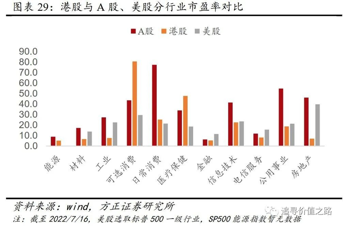 分行业看,在与A股和美股的估值对比中,港股市场除可选消费行业和医疗保健行业市盈率较高,其余行业的估值全面落后于A股和美股市场。港股多数行业估值在全球处于较低水平。