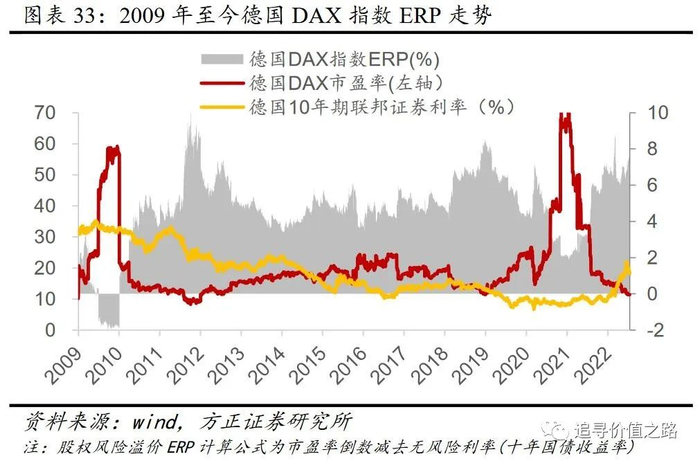 截至2022年7月15日,德国DAX指数的市盈率为11.4倍,德国10年期联邦证券收益率为1.11%,股权风险溢价ERP(市盈率倒数减去无风险利率)为7.65%,当前德国DAX指数ERP位于2009年以来的97%分位数水平,德国股市相较债市的估值性价比极高。