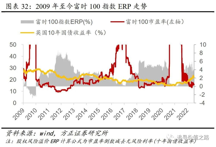 截至2022年7月15日,富时100指数的市盈率为15.7倍,英国10年国债收益率为2.20%,股权风险溢价ERP(市盈率倒数减去无风险利率)为4.16%,当前富时100指数ERP位于2009年以来的68%分位数水平,英国股市相较债市估值性价比适中。