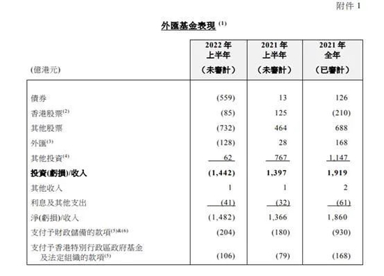 根据香港金管局公布的外汇基金截至2022年6月底未经审计的财务数据显示,外汇基金在2022年上半年录得1442亿港元的投资亏损,其中主要包括:债券投资亏损559亿港元,香港股票投资亏损85亿港元,其他股票投资亏损732亿港元,非港元资产外汇估值下调128亿港元及其他投资收益62亿港元。