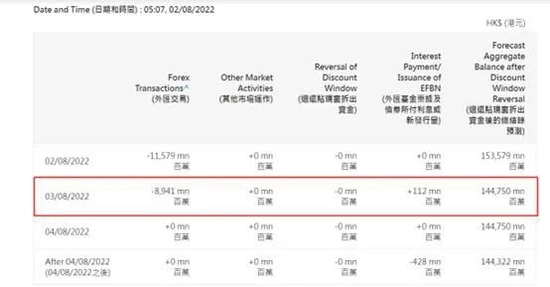 8月2日,港汇再度多次触及7.85的弱方兑换保证,香港金管局根据联系汇率制度,在2日早上5点左右承接89.41亿港元外汇交易沽盘,及外汇基金票据及债券所付利息或新发行量的1.12亿港元,合计90.53亿港元。香港银行体系总结余将于8月3日跌至1447.5亿港元。