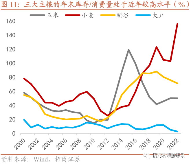对粮价的影响偏长期。高温干旱同样会导致粮食减产,北半球多国已经有所反映。早在5月,世界第二大小麦生产国印度即受高温影响限制小麦出口;截至8月11日,美国西部约70%地区处于干旱状态;美国农业部的预测报告显示,欧洲干旱将导致2022-23年玉米减产六分之一;“水之国”荷兰也在8月宣布全国水位降至历史低点,冲击农业生产和贸易往来。对于我国,8月中下旬是长江中下游地区秋粮产量形成的关键期,川渝地区一季稻开始灌浆结实,高温干旱可能导致中稻、玉米、大豆、一季稻等结实(荚)率、粒重下降,影响产量。好的方面是,得益于粮食安全储备,我国三大主粮的库销比均处于历史较高水平,仅进口依赖度较高的大豆低位运行,可平抑短期粮食供给波动。