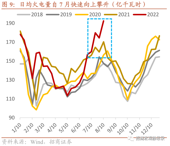 由于风、光电同样受气象条件以及装机量的约束,火电在缺电之际提供了最大的供给弹性。火力发电量自6月下旬开始快速向上攀升,带动日均总发电量大幅超越去年同期。但由于高温导致居民用电量激增,全国电力供应仍然偏紧,特别是水电占比较高、火电对冲弹性偏低的川渝和云贵地区,缺电已经开始影响工业生产。