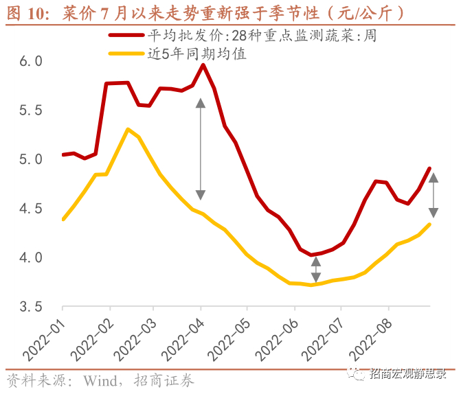 对菜价的影响偏短期。高温干旱显然会抑制蔬菜供给,回顾今年的菜价走势,4月前后疫情冲击物流导致蔬菜供应受阻、价格走势明显强于季节性;4月中旬之后,疫情缓解和保供措施促进蔬菜供应恢复,价格走势开始弱于季节性;7月至今,菜价走势重新强于季节性,考虑到疫情对物流的冲击并不显著,高温干旱削弱供给可能是主要因素。要注意的是,夏季高温干旱与洪涝灾害对菜价的影响过程很可能是类似的,由于蔬菜生产周期较短,灾情过后1-2个月供应即可恢复,将带动价格重新回落。