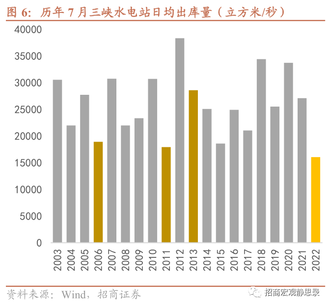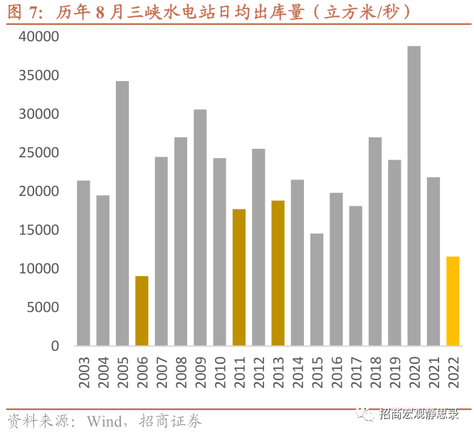 今夏干旱对水力发电能力产生显著冲击。对比2003年以来的7月和8月三峡水库日均出库量,今年7月的出库量是2003年以来最低,8月至今的出库量仅略高于2006年,可见今夏干旱对即期水力发电能力的冲击程度堪称近20年来最强。相应的,旬度发电数据显示,水电量自7月开始从远高于去年同期(5-6月江南水量充沛)的位置回落,至8月上旬已经开始下穿去年同期。