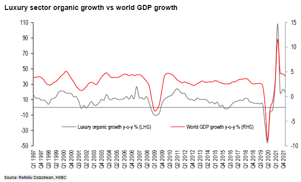 “(奢侈品行业繁荣)是由第一波新冠肺炎疫情后GDP的惊人反弹推动的。如果将奢侈品行业的有机增长与全球GDP进行统计分析,就能发现二者间的相关性相当强(R²=83)。”