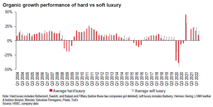 对此,在本周发布的最新研报中,汇丰银行分析师Aurélie Husson-Dumoutier等对全球奢侈品行业展开了详尽分析,得出了“奢侈品业绩再好也是周期股,并不能抵御经济衰退”、“奢侈品行业的降落近在眼前,22Q4业绩承压”、“硬奢风险更高,腕表行业尤甚”等结论。