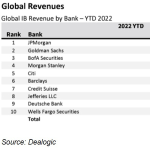 2022年,由于利率不断攀升导致并购成本上升,债务市场融资吸引力减弱,投资银行一直面临着阻力,并且,市场动荡导致部分公司推迟IPO和其他股票发行。这导致了全球投行的收入大幅下降。