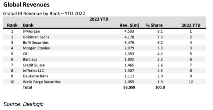 截至2022年年初至今,摩根大通(JPM.US)和高盛(GS.US)都保住了全球投资银行收入来源的第一和第二名的位置,而美国银行证券(BAC.US)上升一个名次至第三名,将摩根士丹利(MS.US)挤至第四名。花旗(C.US)继续位列第五位,富国银行(WFC.US)排名第十,比去年上升了两位。