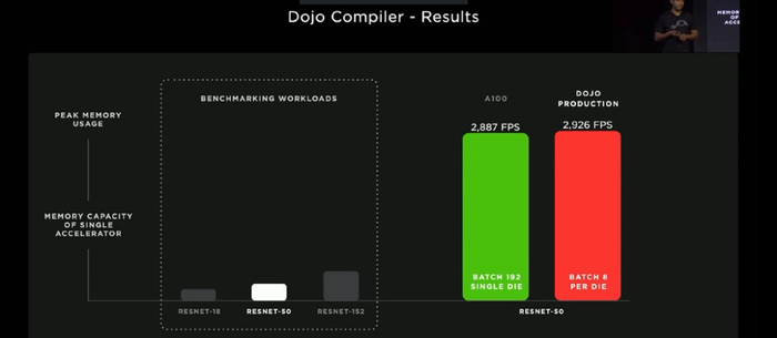 成果:一个Dojo瓦片取代6个GPU盒子上的ML计算机,而成本比一个GPU盒子还低。一个多月时间来训练的网络现在只需要不到一个星期