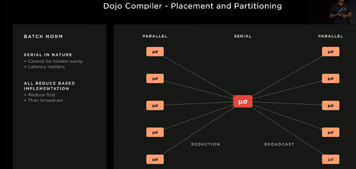 高密度集成是为了加速模型的计算约束和延迟约束部分;Dojo网格的一个片断可以被分割出来运行模型(只要分片足够大);统一的低延迟中的细粒度同步原语加速跨集成边界的并行性;Tensors是以RAM的形式存储Chardon,并在各层执行时及时复制;张量复制的另一个数据传输与计算重叠,编译器也可重新计算层。