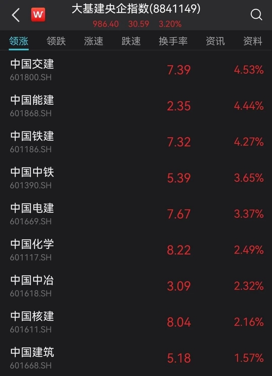 21日早盘,大基建央企领涨。其中,中国交建、中国中铁、中国电建、中国建筑都是千亿市值的权重大蓝筹。