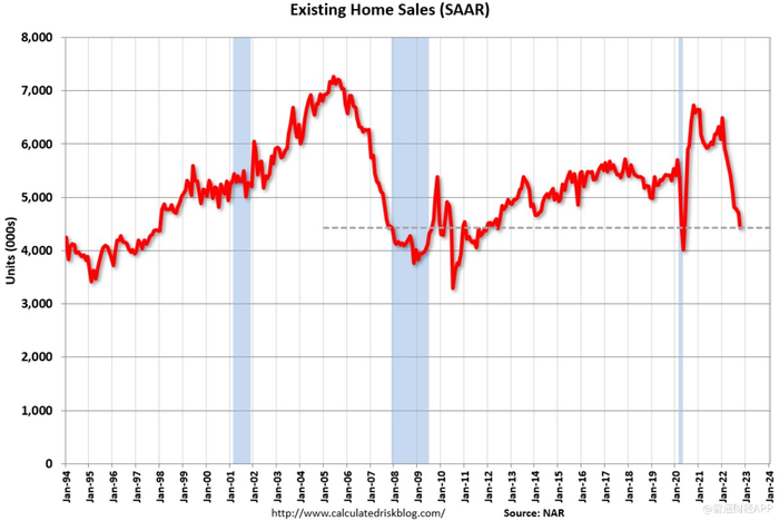 全美房地产经纪人协会(NAR)的数据显示,10月份的成屋销售较9月份下降了5.9%,经季节性调整后的年率为443万套,同比下降28.4%。如不计入2020年5月新冠疫情刚开始时出现的销售急剧放缓,现在的销售速度是自2011年12月以来最慢的。