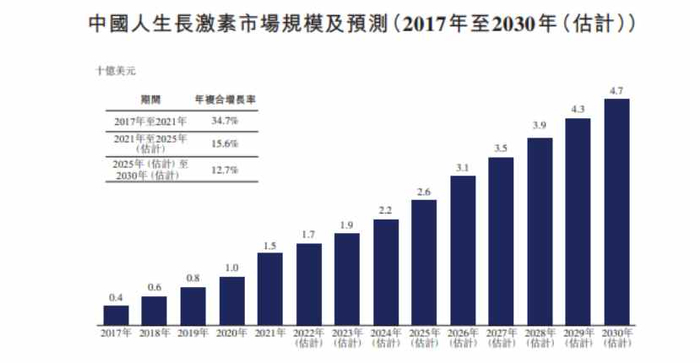 根据弗若斯特沙利文的资料,中国人生长激素市场规模由2017年的4亿美元迅速增至2021年的15亿美元,年复合增长率为34.7%,预计到2025年将持续增至26亿美元,自2021年至2025年的年复合增长率为15.6%,并且到2030年将增至47亿美元(约合人民币337.5亿元),自2025年至2030年的年复合增长率为12.7%。
