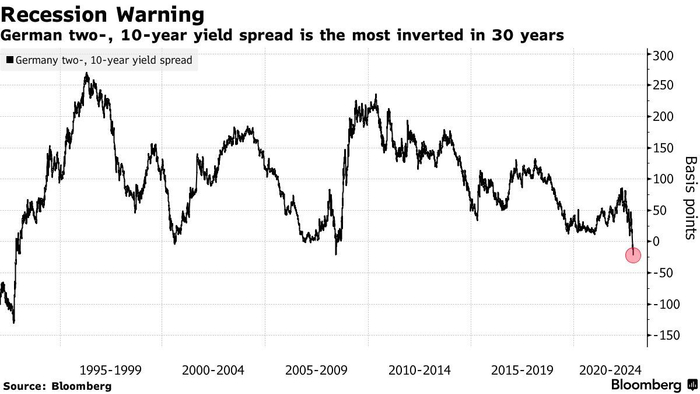 在周三,德债收益率曲线出现大幅度倒挂,2年期德国国债收益率在收盘时显著高于10年期德国国债收益率,并且倒挂幅度创下1992年以来的最高水平。仅仅两周之前,德国国国债收益率就曾出现自2020年新冠疫情以来最大规模倒挂。德国债券市场正发出经济衰退信号,表明这个欧洲最大的经济体正逐步滑向衰退。