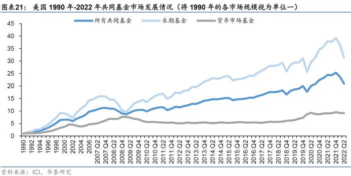 而有了养老金账户的资金来源,共同基金中的长期基金规模在 1990 年至 2022 年第二季度期间增长最为明显(将 1990 年的各基金市场规模视为单位一),而得到养老金支持最少的货币市场基金相对而言规模增长较慢。