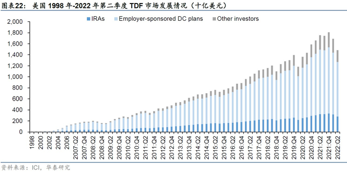 目标风险基金(TRF):受个人养老金账户资金的追捧。相比于 TDF 产品, TRF 需要雇员或投资者在投资时进行主动选择。TRF 的规模相比于 TDF 较小,在 2021 年第二季度的规模 0.42 万亿美元,不及同期 TDF的 25%,且在 2006 年以后,其他投资者的投资份额占比均大于 50%。这说明美国的养老金计划持有者更倾向于投资无需自己主动选择的 TDF,从而让自己在退休时间附近获得相对稳定的现金流,而不是一直持有一定风险等级的产品。