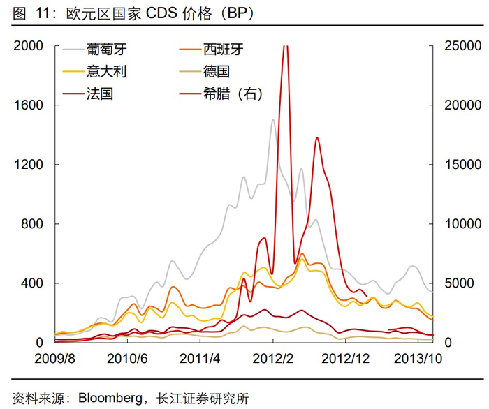 欧元区整体信用受到牵连,危机蔓延到核心国家。随着希腊债务危机持续发酵,欧元区其他国家也被动陷入信用危机:一方面,欧元区国家经济、贸易联系紧密,其他国家的经济发展受此拖累;另一方面,各国之间相互持有国债,主权债务违约致使债权国资产负债表恶化。2011年9月,欧元区第三大经济体意大利债券评级也被调降,欧元区资产安全的担忧不断蔓延,资金开始加速流出欧元区,引发包括德国、法国在内的各国CDS快速攀升。