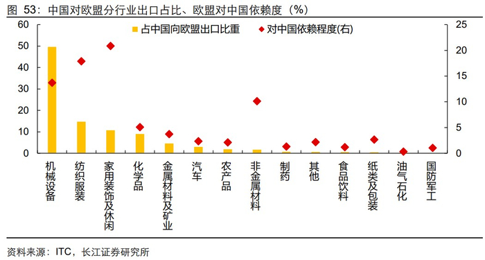 首先,欧洲经济走向衰退意味着需求下滑,或对中国出口整体形成抑制。从上一轮欧债危机的经验来看,危机期间欧洲经济衰退对我国出口抑制明显,2010至2012年我国对欧出口增速持续走弱并最终转负,出口明显承压。而当前欧元区需求已出现走弱迹象,消费者信心指数连续数月下滑,也指向未来出口下行风险较大。从出口结构上来看,中国出口欧盟占比最大的机械设备——包括工业机械、家用电器、计算机、通讯设备等产品,以及欧盟对中国依赖度较高的家居用品、服装等或将受到一定冲击。