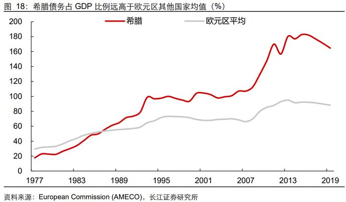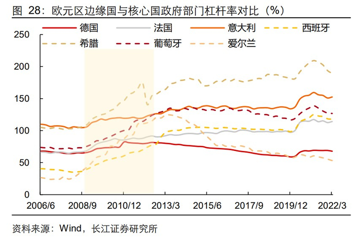 另一方面,割裂的财政政策意味着各国可以自由举债。希腊加入欧元区之后,本该持续削减政府债务,然而欧元区强大的背书使得希腊等边缘国家的借贷成本不断向核心国家收敛。低利率环境下,边缘国进行了大规模的财政扩张,2005-2015十年间西希葡爱四国平均政府杠杆率接近翻倍,而德法两国仅增长25%左右,边缘国债务风险持续升温。