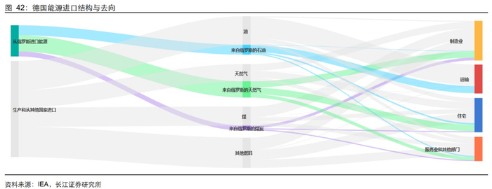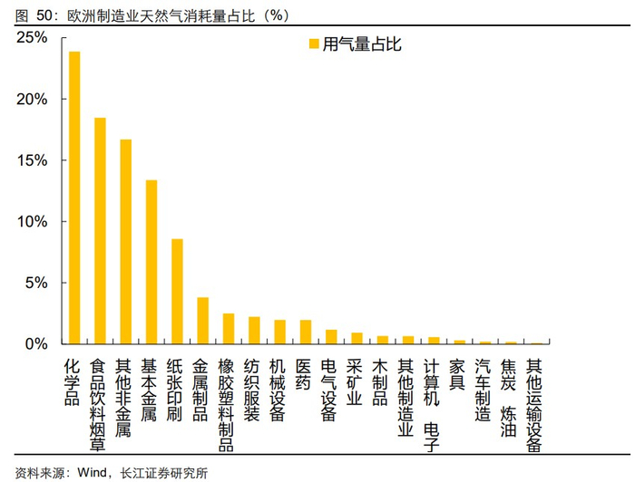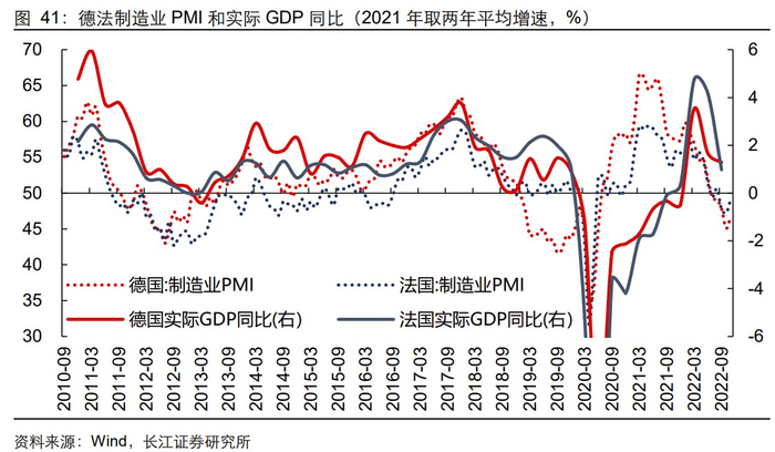 制造业生产对俄罗斯能源依赖度较高,成本被动升高。与法国相比,德国对俄罗斯能源高度依赖,俄罗斯天然气约占总需求的1/2左右,并广泛用于德国制造业、运输、居住等领域。因此,北溪管道供给不足严重限制了德国制造业的生产运营,德国部分企业被迫停产或减产,甚至考虑在海外设厂以获得更低的运营成本,推高了制造业的生产成本。同时,德国家庭一半以上的供暖能源也来源于俄罗斯天然气,在冬季住宅用气量大幅增加的背景下,德国工业用气需求更加难以满足,经济前景难言乐观。