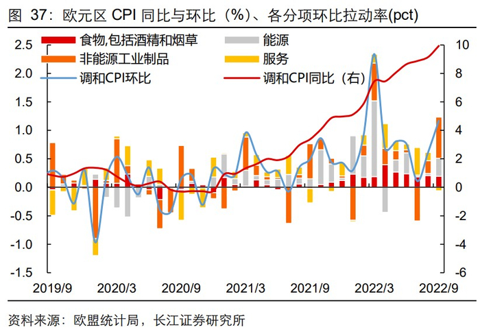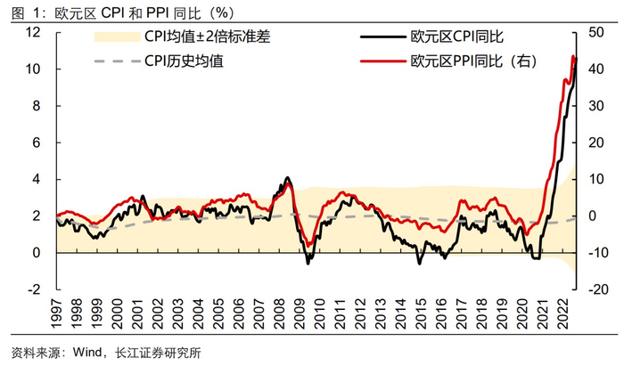 风险事件频发,欧元区通胀风险飙升。疫后全球修复进程坎坷,去年底航运堵塞导致的供应链危机刚刚过去,今年初俄乌冲突的爆发又再度引爆了能源价格,导致全球面临持续的供给端压力。作为对俄罗斯原油、天然气等能源依赖度较高的经济体,能源供给短缺导致欧元区通胀水平不断创下历史新高。截至9月,欧元区CPI、PPI同比分别上涨9.9%、41.9%,远超历史均值水平。