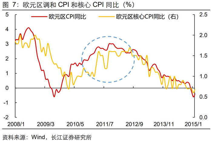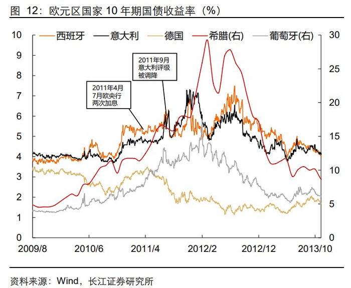 雪上加霜的是,2011年欧央行希望通过激进加息以防通胀,却再度加大了边缘国债务压力。2010年末,在低基数以及能源和粮食价格上涨的影响下,欧元区通胀出现了持续性的走高,CPI同比涨幅短暂突破欧央行制定的2%目标水平。出于防通胀的考虑,欧央行选择于2011年4月和7月上调了两次基准利率。虽然通胀最终得到了良好控制,但这一举措却带来了更加严重的副作用:利率走高使得边缘国家债务成本进一步增加,危机再度升级。