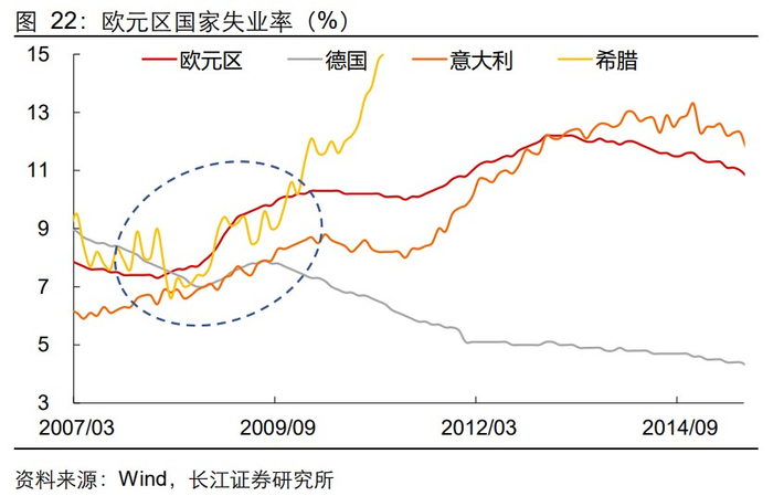除了自身财政的问题外,次贷危机的冲击也是重要诱因。2008年次贷危机的爆发对欧洲乃至全球产生了严重的冲击,而其中,由对外依赖度较高的旅游业为主导产业的希腊受到更加严重的冲击,导致财政收入大幅萎缩,失业率也快速攀升。反观德国这样的以制造业为主的国家,其对外的依赖度相对较低,因此经济和就业市场所受影响相对较小。