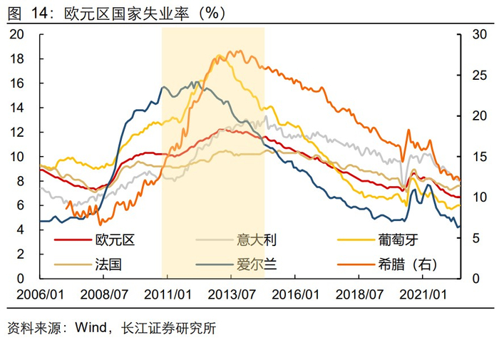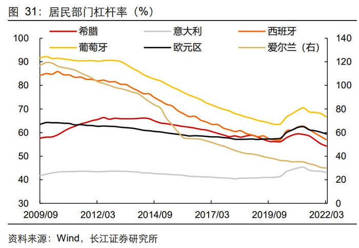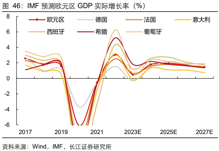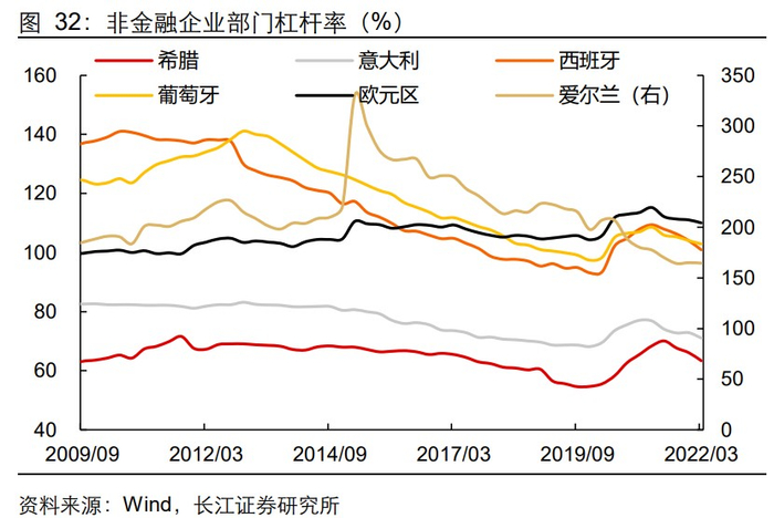 同时,企业、居民经历去杠杆过程,资产负债表相对健康。欧债危机之后,在欧央行、欧盟委员会及IMF的协调下,欧元区经历了一系列的去杠杆过程,居民杠杆率和非金融企业杠杆率水平持续下降。尽管疫情期间杠杆率水平略有上升,但整体来看,当前企业和居民部门的资产负债表仍处于相对健康的水平。
