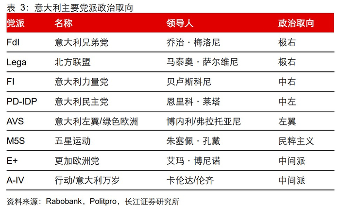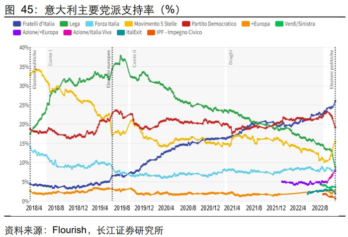 除能源危机外,欧洲还面临着政局的动荡。意大利是多党制国家,在过去的历史中,意大利没有任何一个政党在选举中获得过40%以上的支持率,只能通过多党派组建联合政府。而这一体制给政府执政增加很多难度,党派之间的分歧令政策难以延续,因此,意大利自二战以来的每届政府平均寿命不到一年半,政府更迭十分频繁。