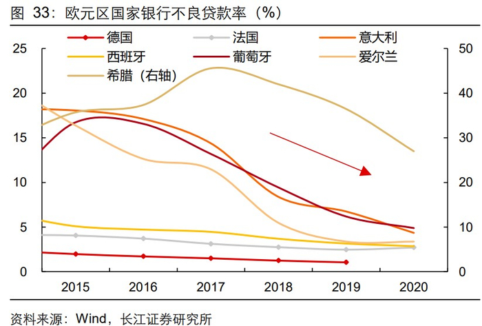 从传导体系来看,本轮外部冲击更多是在实体冲击,银行业状况有所改善。上轮危机中银行业经历次贷危机,抗压能力较弱,金融系统的流动性危机成为了欧债危机的放大器。在债务危机得到处理后,欧元区银行业状况也在一系列监管调整下有所改善,银行不良贷款率持续下行。本轮疫情对实体的冲击要明显强于金融业,衡量偿付能力的CET1资本比率[1]仍然较高,意味着银行体系相对健康,流动性压力不大。