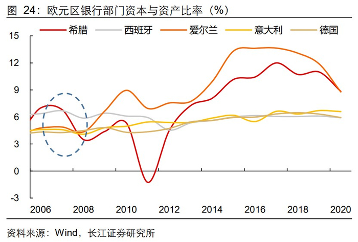 欧洲银行业在次贷危机中受损严重,为欧债危机的发生埋下隐患。由于欧洲银行持有大量美国房地产CDO,当美国房地产泡沫破灭时,欧洲银行不得不面临巨额亏损。尽管欧洲各国通过政府大量发行国债对银行进行救助,最终帮助其度过难关,但仍然导致银行承受风险的能力大幅下降,为欧债危机的发生埋下隐患。
