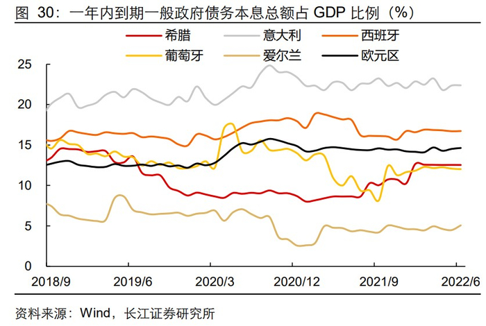 从财政赤字角度来看,疫后各国财政支出扩大,但债务压力明显低于上轮水平。在新冠疫情爆发之前,希腊等国已积极缩减财政赤字,政府杠杆率也走向平稳。但疫后为了刺激经济复苏,欧元区各国均大幅举债,同时欧央行推出抗疫紧急购债计划进行支持,又再度推升了欧元区国家财政赤字水平。与上轮危机爆发时相比,希腊、葡萄牙、爱尔兰和西班牙的财政压力均有所改善,但意大利的赤字水平却不降反升。
