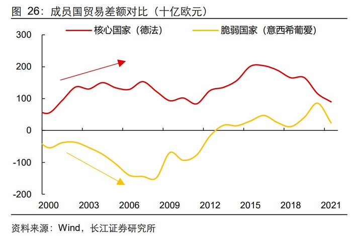 欧元区“碎片化”现象严重,边缘国与核心国家的抗压能力之间存在差异。尽管加入欧元区需要满足严苛的条件,但仍然无法保证组成联盟的各成员国具有相同的禀赋,自欧元区成立以来,德国、法国等国凭借强大的制造业出口积累了大量贸易顺差,GDP占比不断提升,而反观希腊、葡萄牙等边缘国家,由于其产业结构偏重服务业,经济发展动能对外依赖较高,贸易持续出现赤字,造成欧元区内部的“碎片化”问题不断加剧。
