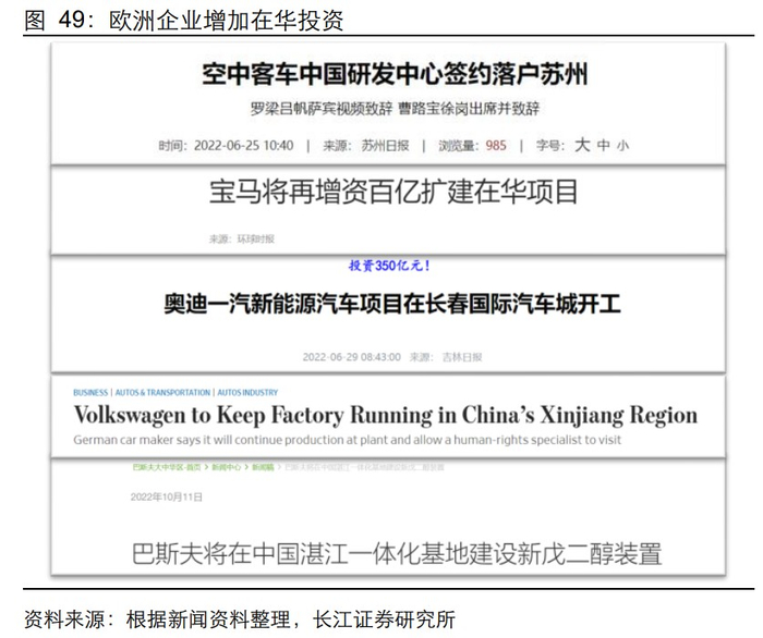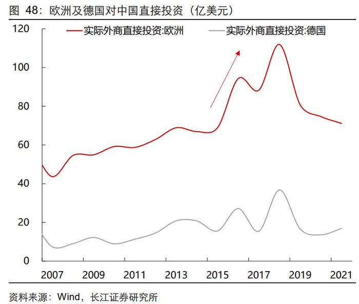 首先,欧洲资本或将向中国加速流动。上一轮欧债危机爆发后,欧央行实施量化宽松向市场释放了大量资金,我国凭借较高的增长潜力吸引了大量欧洲资本流入,欧洲外商投资规模在2015至2019年期间持续增加,加速了我国经济的发展。在当前欧元区的高通胀压力下,宝马、奥迪、巴斯夫等欧洲企业为了降低生产成本开始将相关产线向中国转移,我国也因此迎来更多的外商对华投资。