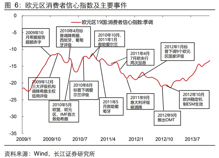 希腊成为多米诺骨牌中倒下的第一张。2009年10月,刚换届上台的希腊政府发现该国债务状况存在明显的“统计错误”,宣布将2009年财政赤字和政府负债占GDP的比例分别上修至12.7%和113%。而这一水平,已经远远超出欧元区《稳定与增长公约》规定的3%和60%,引发惠誉、标普、穆迪三大信用评级机构相继调降该国的主权债务评级,希腊国债被大规模抛售,国债利率飙升。2010年4月,严重恶化的财政状况和沉重的债务负担下,希腊正式向欧盟和IMF申请援助。随着希腊的“倒牌”,爱尔兰、葡萄牙、西班牙等欧元区边缘国也相继报告了高额的财政赤字,债务危机在欧洲大陆快速蔓延,消费者信心持续回落。