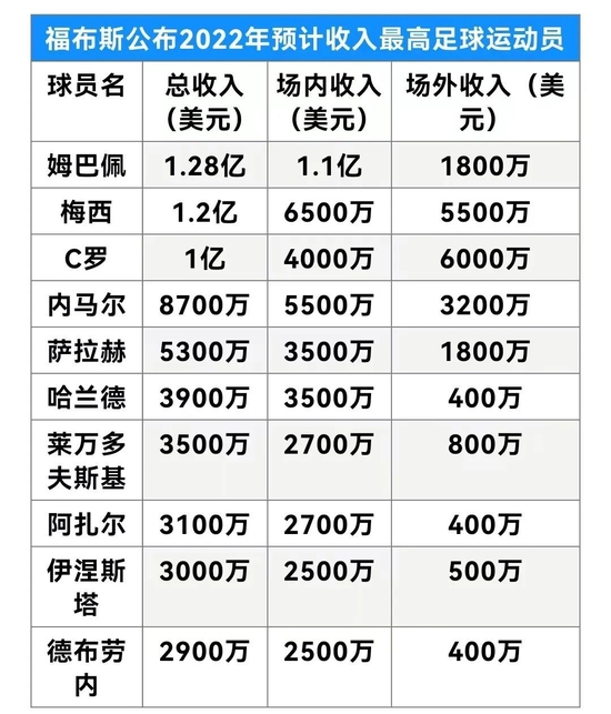 据《福布斯》杂志10月份公布的2022年足球运动员收入排行榜显示,
